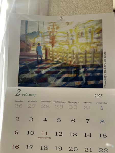 写真は,香本博さんの2月のカレンダー「朝が通過する踏切」です。